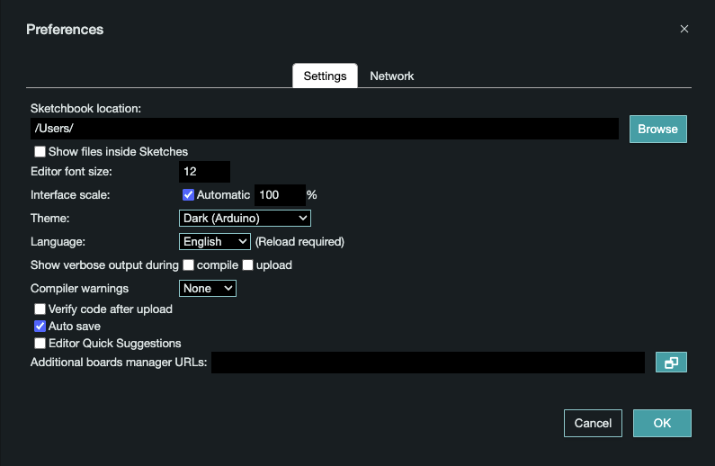 맥: Arduino IDE -> Preferences (단축키: command + ,)