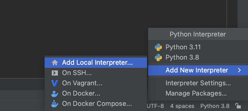 여기서 추가를 할려면 Add New Interpreter -> Add Local Interpreter를 눌러 창을 열어줍니다.