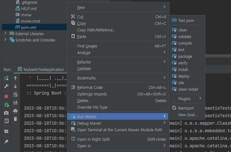 3번째 방법으로 pom.xml에서 우클릭 -> Run Maven -> Reimport 또는 위 명령어들 중 상황에 맞는 기능을 실행 시킬 수 있습니다.