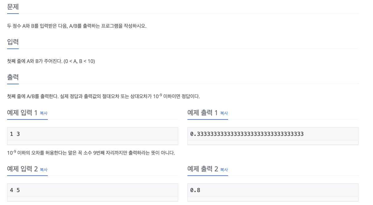 첫째 줄에 A/B를 출력한다. 실제 정답과 출력값의 절대오차 또는 상대오차가 10^-9 이하이면 정답이다.
