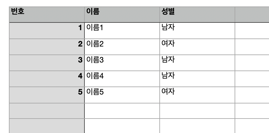 번호: 4, 이름: '이름4', 성별: '남자'