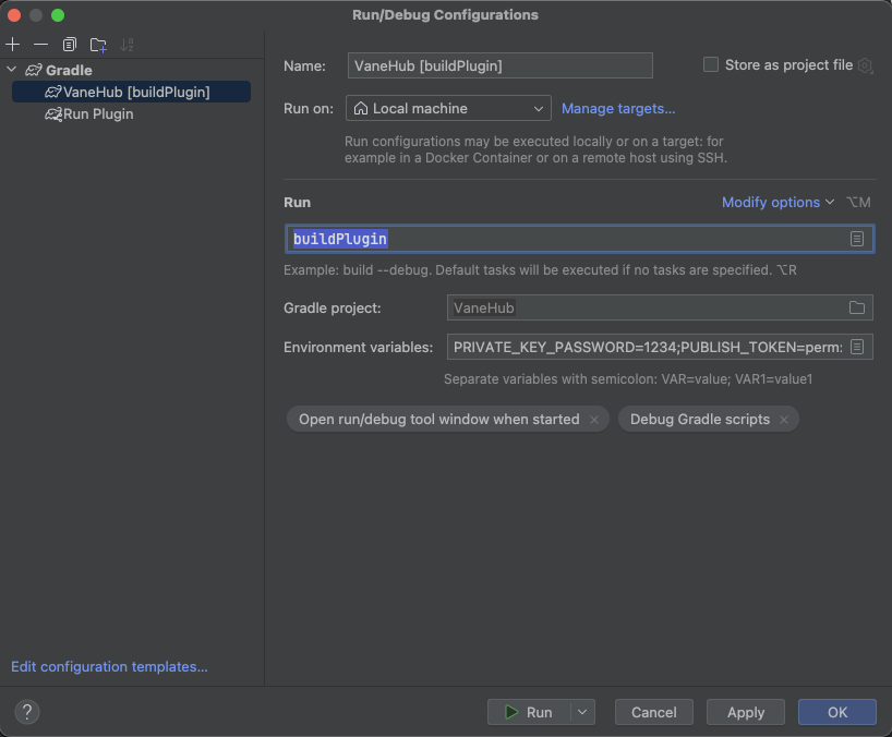 환경변수에 등록해야하는 경우 Gradle실행에 Run을 buildPlugin으로 설정해주시고 환경설정 세팅 후 실행을 해주시면됩니다.