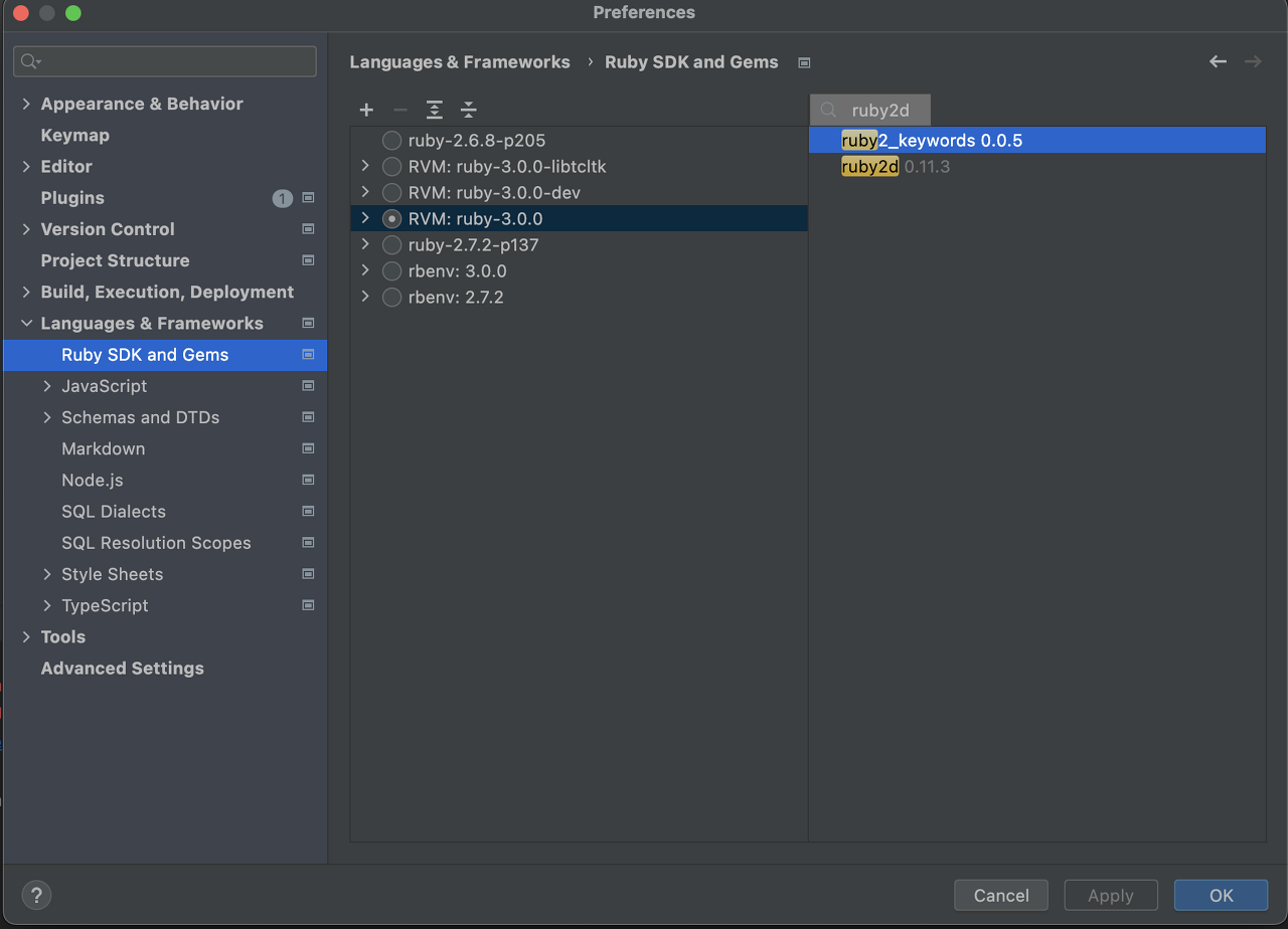 Languages & Frameworks -> Ruby SDK and Gems에 가보게 되면 지금까지 설치한 ruby 버전들을 볼 수 있는데요.