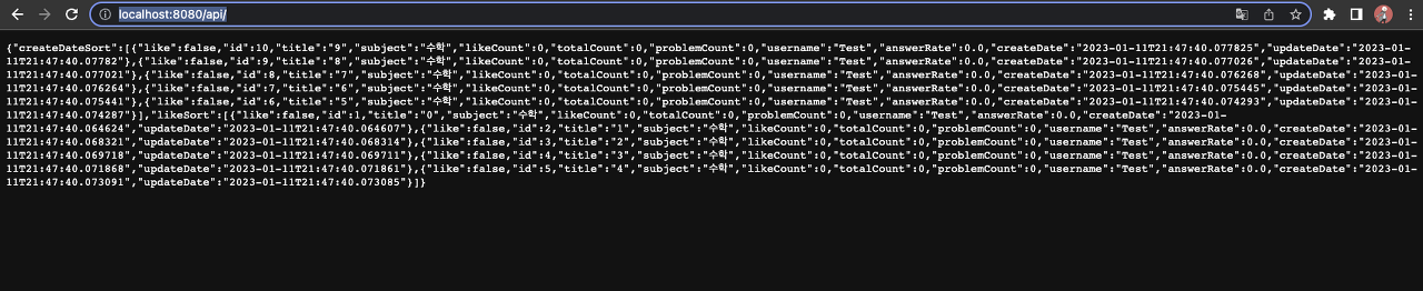 예제 데이터로 최신순으로 생성된 글 createDateSort과 좋아요 순으로 정렬된 글 likeSort를 반환해주는 로직입니다.
