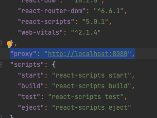 프로젝트에 package.json이라는 파일에 "proxy": "http://localhost:8080"를 추가해 줍니다. url포트나 링크가 다르면 링크 값은 백앤드 url로 변경해주시길 바랍니다.