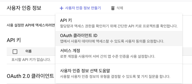 상단에 사용자 인증 정보 만들기 -> OAuth 클라이언트 ID를 눌러줍니다.