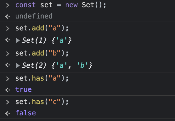 set에 값을 포함한다면 true를 반환하고 값이 존재하지 않는다면 false를 반환합니다.