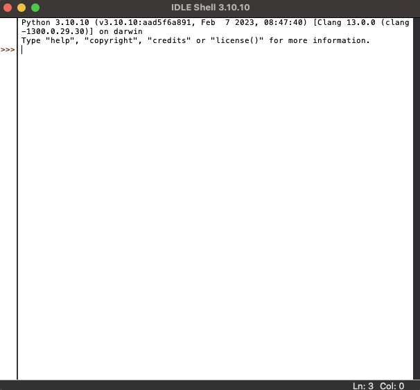 우선은 파이썬을 실행해줍니다. (저는 IDLE를 실행하였지만 터미널에서도 똑같이 입력해주시면 됩니다.)