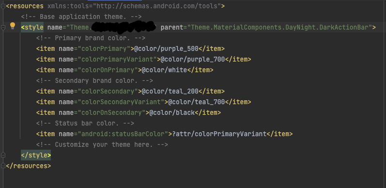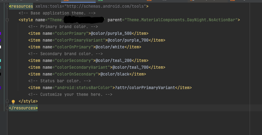 Theme.MaterialComponents.DayNight.DarkActionBar를Theme.MaterialComponents.DayNight.NoActionBar로 변경하시면 됩니다.